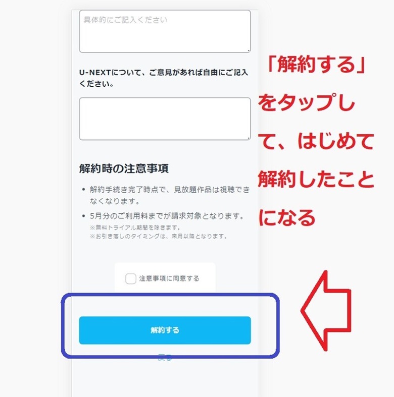 アンケートに答え、「解約時の注意事項」にチェック、画面下の「解約する」をタップします。